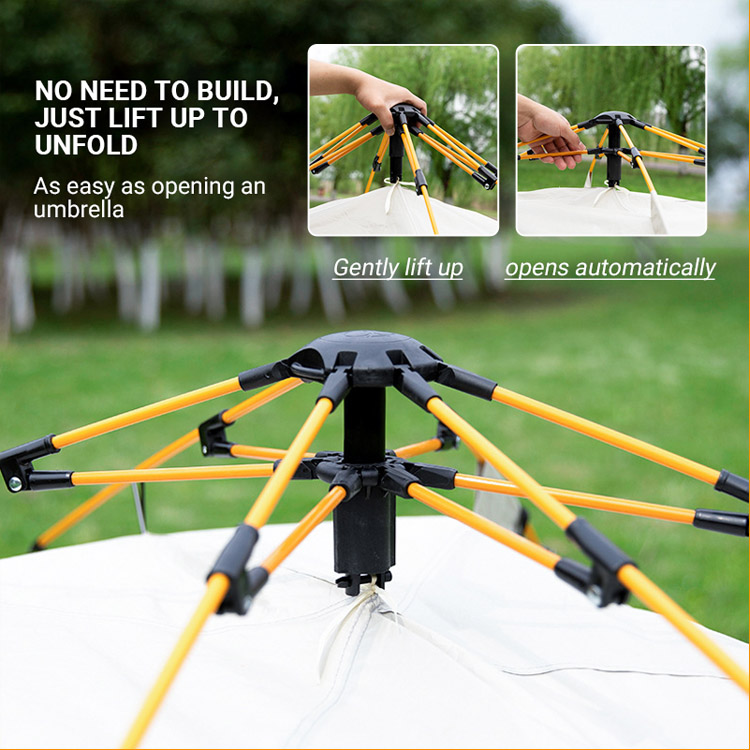 వినూత్నమైన ఆటోమేటిక్ ఓపెనింగ్ టెక్నాలజీని కలిగి ఉంటుంది, ఇది టెంట్ను సెకన్లలో పూర్తి ఆకృతిలోకి మార్చడానికి అనుమతిస్తుంది, సంక్లిష్టమైన అసెంబ్లీ విధానాలను తొలగిస్తుంది మరియు విలువైన క్యాంపింగ్ సమయాన్ని ఆదా చేస్తుంది.