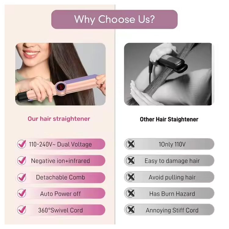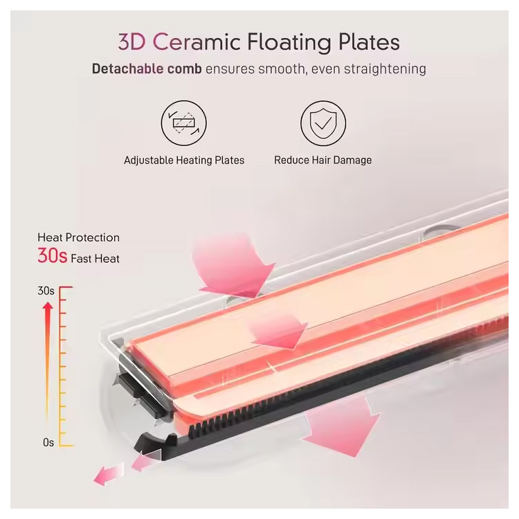 ఈ స్ట్రెయిట్నర్ ఇన్ఫ్రారెడ్ హీట్ని ఉపయోగించి హెయిర్ షాఫ్ట్లోకి మెల్లగా చొచ్చుకుపోతుంది, జుట్టును లోపలి నుండి వేడి చేస్తుంది. ఇది తేమను లాక్ చేస్తున్నప్పుడు ఉపరితల నష్టాన్ని తగ్గిస్తుంది, ఫలితంగా మెరుగైన బలం మరియు స్థితిస్థాపకతతో మృదువైన, మెరిసే జుట్టు వస్తుంది.