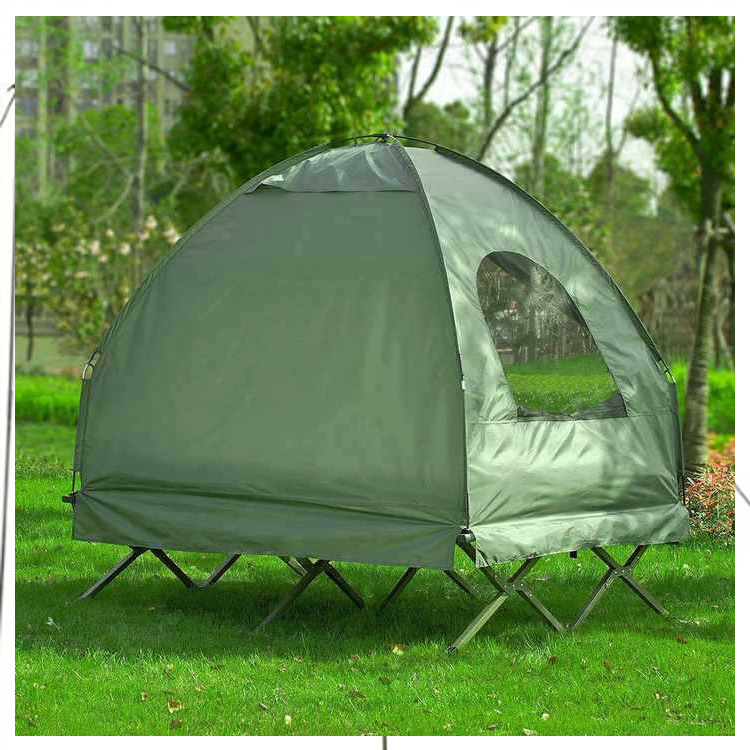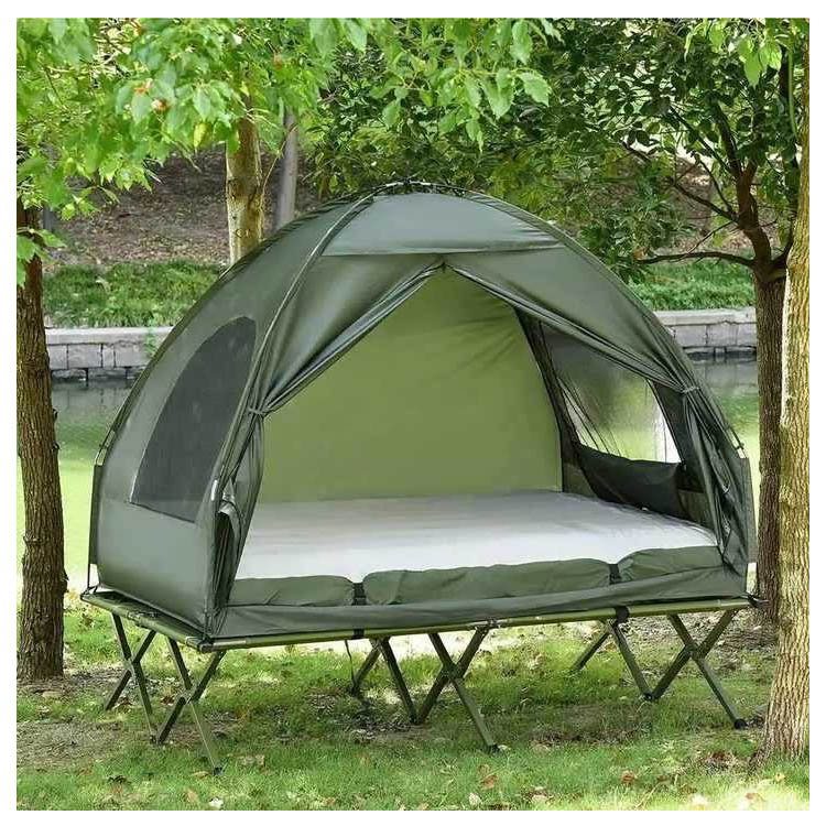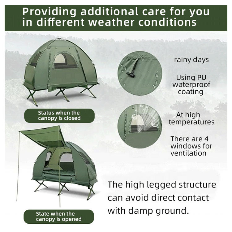 అంతర్నిర్మిత, ఎలివేటెడ్ స్లీపింగ్ ప్లాట్ఫారమ్ను కలిగి ఉంటుంది, ఇది తేమ-ప్రూఫ్ రక్షణను మెరుగుపరచిన సౌకర్యంతో మిళితం చేస్తుంది, తేమతో కూడిన నేల నుండి మిమ్మల్ని ప్రభావవంతంగా వేరు చేస్తుంది మరియు ఇన్సులేషన్ను మెరుగుపరుస్తుంది.