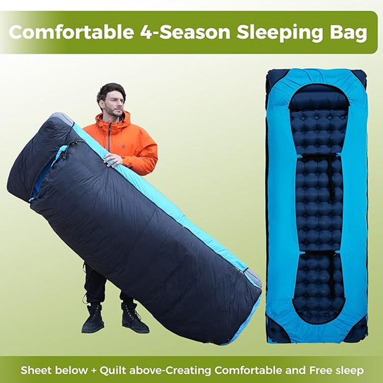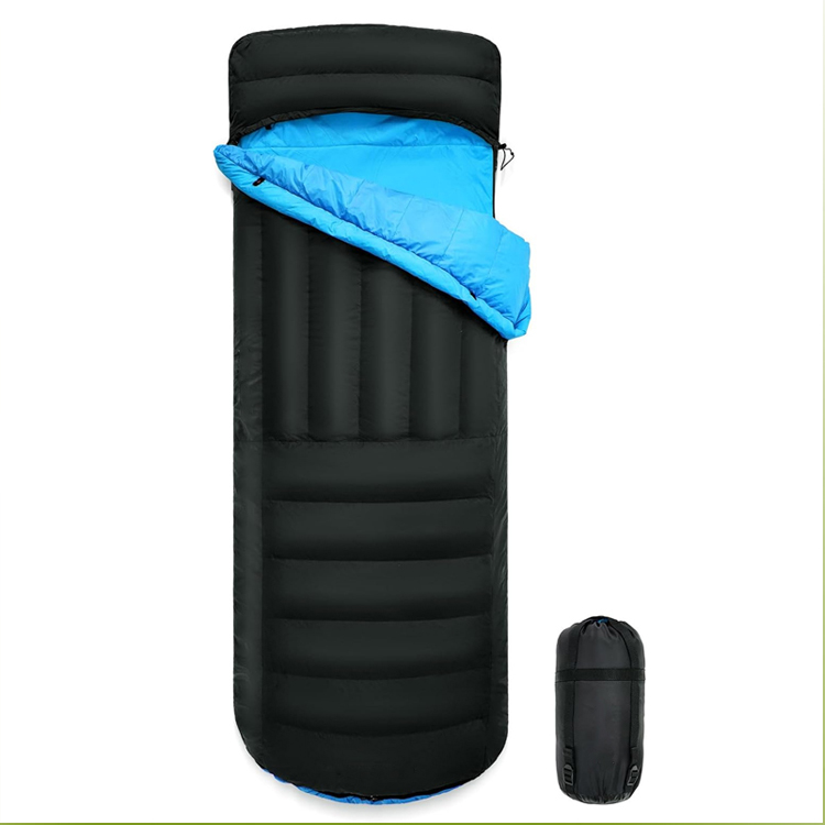 అల్ట్రాలైట్ డౌన్ క్యాంపింగ్ బ్లాంకెట్ డక్ డౌన్ స్లీపింగ్ ప్యాడ్. వైల్డర్నెస్ అడ్వెంచర్స్ కోసం మీ అల్టిమేట్ ఫోర్-సీజన్ స్లీప్ సిస్టమ్. ఈ అల్ట్రాలైట్ డౌన్ స్లీపింగ్ బ్యాగ్ ప్రీమియం డక్ డౌన్ ఇన్సులేషన్ను ఇంటిగ్రేటెడ్ ఇన్ఫ్లేటబుల్ ప్యాడ్తో కలుపుతుంది. టాప్క్విల్ట్ మరియు స్లీపింగ్ బ్యాగ్గా పని చేస్తుంది, ఇది బరువు తగ్గకుండా గరిష్ట వెచ్చదనాన్ని అందిస్తుంది.