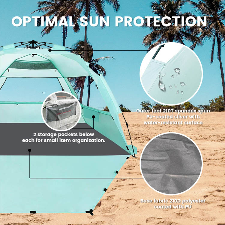 ప్రత్యేకమైన వెండి పూతతో కూడిన ఫాబ్రిక్ 98% హానికరమైన UV కిరణాలను అడ్డుకుంటుంది, అయితే అద్భుతమైన గాలి ప్రవాహాన్ని కొనసాగిస్తుంది, పొడిగించిన బీచ్ బసల కోసం చల్లని షేడెడ్ ప్రాంతాన్ని సృష్టిస్తుంది.